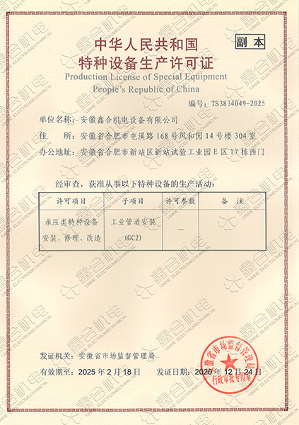 目前我公司具有建筑機電安裝工程專業(yè)承包一級資質、總承包二級、GC2壓力管道設計、施工資質。現(xiàn)有高級工程師5名、高級技師55名、工程師22名、助工25名、技術員22名、各類專業(yè)技師50多名,強大的技術力量及精良的施工隊伍,為客戶提供全方位服務。 公司本著“一切為了用戶”的經(jīng)營理念,“以品質求生存、以誠信贏市場、以管理促發(fā)展”為要求,努力為廣大客戶提供專業(yè),優(yōu)質、高效的服務。
